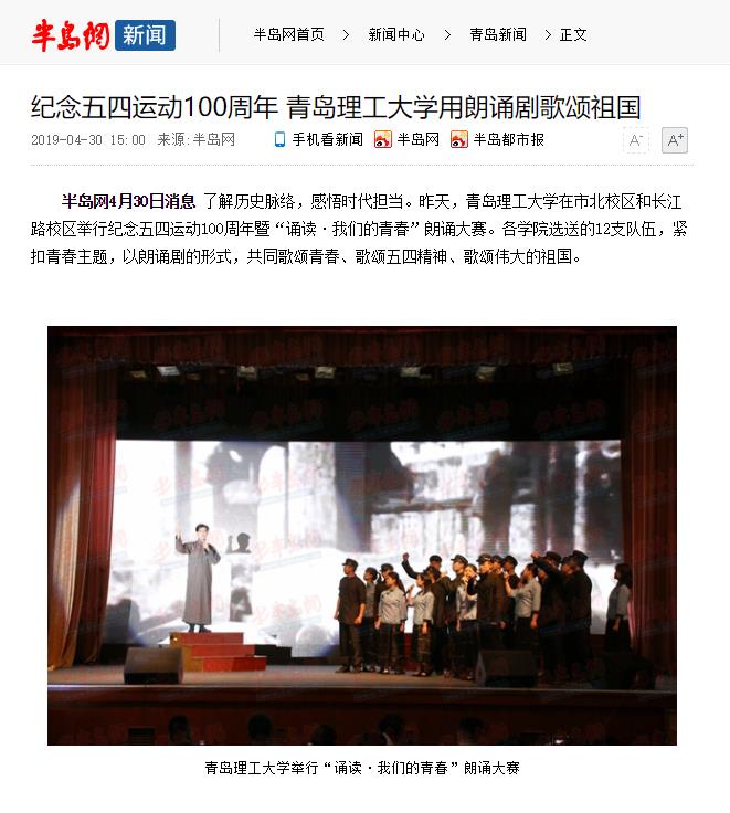 半岛网4月30日消息 了解历史脉络,感悟时代担当。昨天,伟德国际1946bv官网在市北校区和长江路校区举行纪念五四运动100周年暨“诵读·我们的青春”朗诵大赛。各学院选送的12支队伍,紧扣青春主题,以朗诵剧的形式,共同歌颂青春、歌颂五四精神、歌颂伟大的祖国。