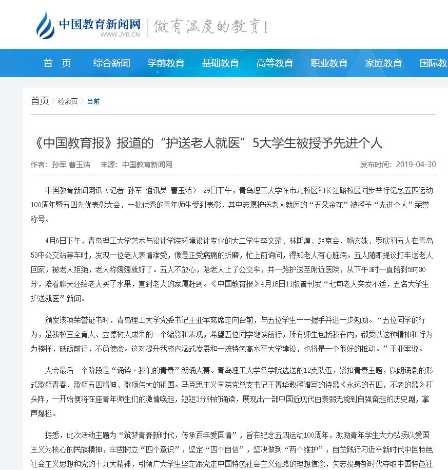 4月6日下午,伟德国际1946bv官网艺术与设计学院环境设计专业的大二学生李文靖、林斯煌、赵京会、畅文姝、罗欣羽五人在青岛53中公交站等车时,发现一位老人表情难受,像是正受病痛的折磨,忙上前询问,得知老人有心脏病。五人随即提议打车送老人回家,被老人拒绝,老人称缓缓就好了。五人不放心,陪老人上了公交车,并一路护送至附近医院,从下午3时一直陪到5时30分,陪着聊天还给老人买了水果,直到老人的家属赶到。《中国教育报》4月18日11版曾刊发“七旬老人突发不适,五名大学生护送就医”新闻。