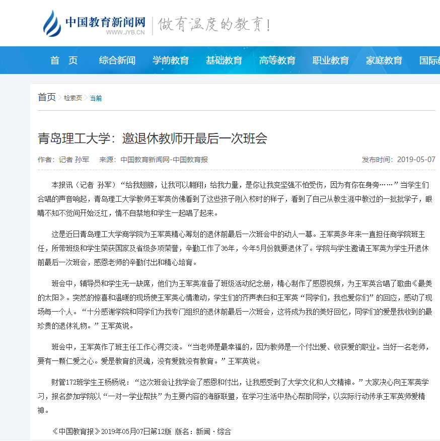 班会中,辅导员和学生无一缺席,他们为王军英准备了班级活动纪念册,精心制作了感恩视频,为王军英合唱了歌曲《最美的太阳》。突然的惊喜和温暖的现场使王军英心情激动,学生们的齐声表白和王军英“同学们,我也爱你们”的回应,感动了现场每一个人。“十分感谢学院和同学们为我专门组织的退休前最后一次班会,这将成为我的美好回忆,同学们的爱是我收到的最珍贵的退休礼物。”王军英说。