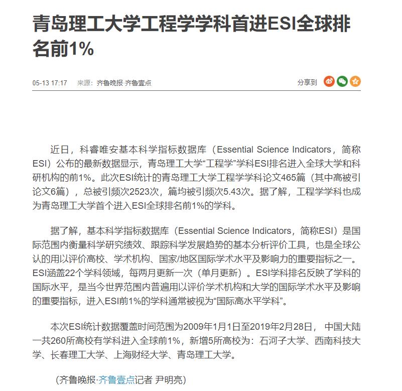 近日,科睿唯安基本科学指标数据库(Essential Science Indicators,简称ESI)公布的最新数据显示,伟德国际1946bv官网“工程学”学科ESI排名进入全球大学和科研机构的前1%。此次ESI统计的伟德国际1946bv官网工程学学科论文465篇(其中高被引论文6篇),总被引频次2523次,篇均被引频次5.43次。据了解,工程学学科也成为伟德国际1946bv官网首个进入ESI全球排名前1%的学科。