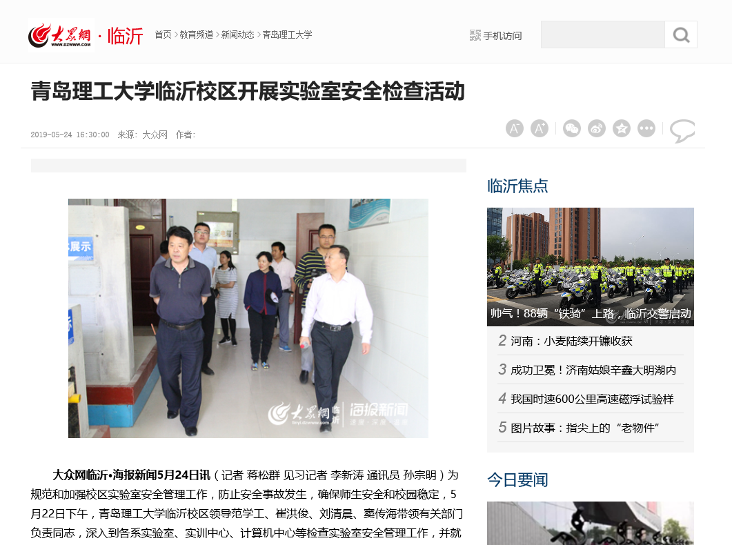 大众网临沂·海报新闻5月24日讯(记者 蒋松群 见习记者 李新涛 通讯员 孙宗明)为规范和加强校区实验室安全管理工作,防止安全事故发生,确保师生安全和校园稳定,5月22日下午,伟德国际1946bv官网临沂校区领导范学工、崔洪俊、刘清晨、窦传海带领有关部门负责同志,深入到各系实验室、实训中心、计算机中心等检查实验室安全管理工作,并就有关工作进行部署。