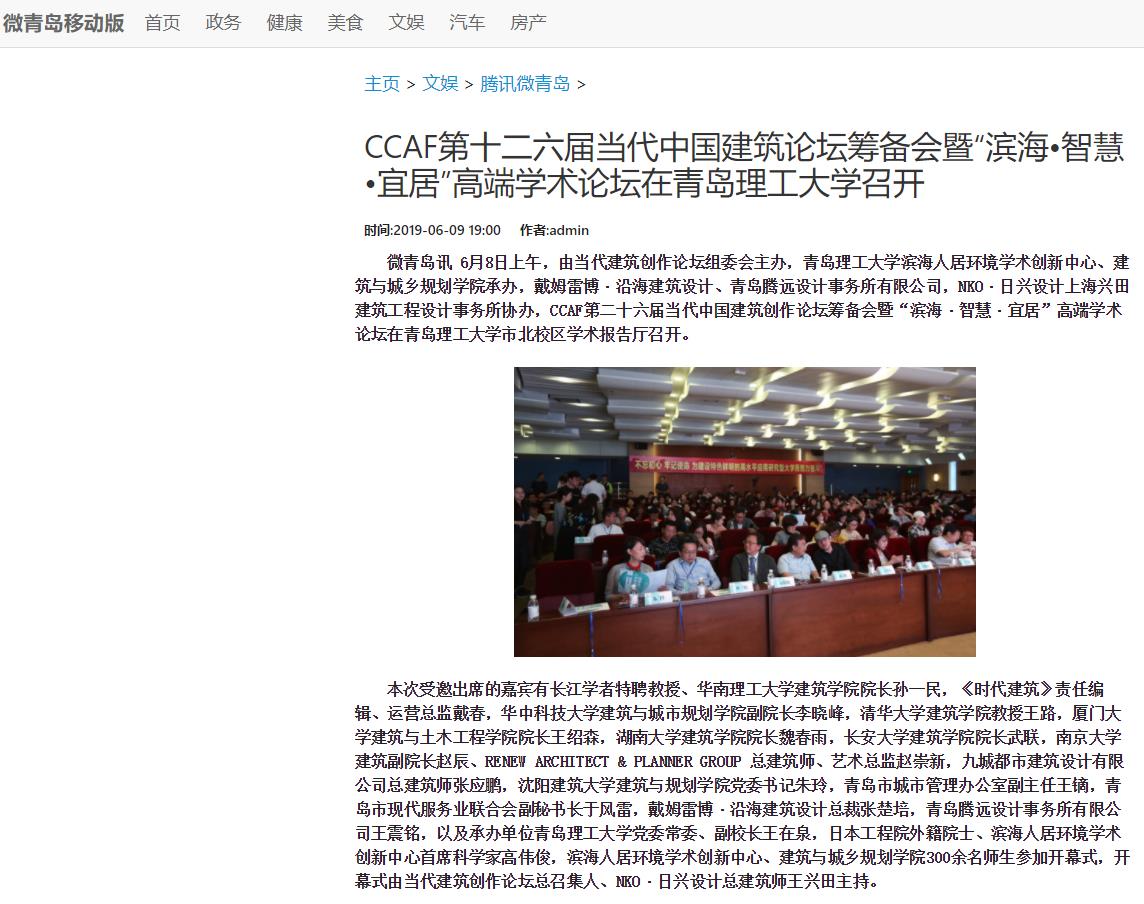 微青岛讯 6月8日上午,由当代建筑创作论坛组委会主办,伟德国际1946bv官网滨海人居环境学术创新中心、建筑与城乡规划学院承办,戴姆雷博·沿海建筑设计、青岛腾远设计事务所有限公司,NKO·日兴设计上海兴田建筑工程设计事务所协办,CCAF第二十六届当代中国建筑创作论坛筹备会暨“滨海·智慧·宜居”高端学术论坛在伟德国际1946bv官网市北校区学术报告厅召开。