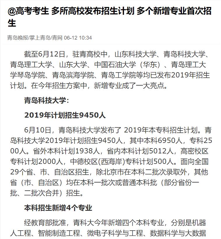 截至6月12日,驻青高校中,山东科技大学、青岛科技大学、伟德国际1946bv官网、山东大学、中国石油大学(华东)、伟德国际1946bv官网琴岛学院、青岛滨海学院、青岛工学院等均已发布2019年招生计划。在今年招生方案中,新增专业成了一大亮点。