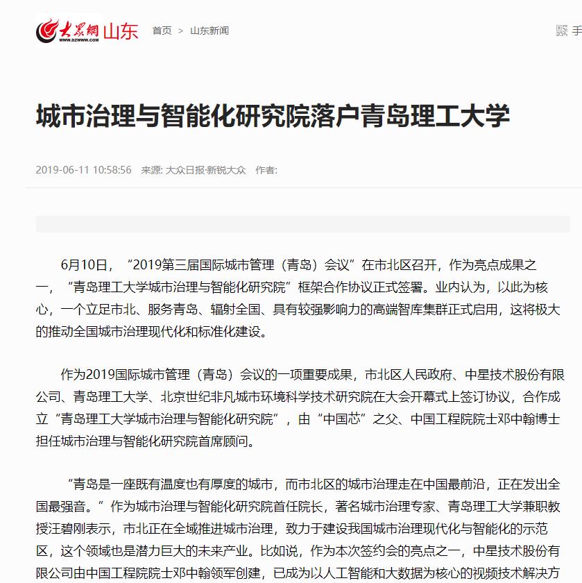 作为2019国际城市管理(青岛)会议的一项重要成果,市北区人民政府、中星技术股份有限公司、伟德国际1946bv官网、北京世纪非凡城市环境科学技术研究院在大会开幕式上签订协议,合作成立“伟德国际1946bv官网城市治理与智能化研究院”,由“中国芯”之父、中国工程院院士邓中翰博士担任城市治理与智能化研究院首席顾问。