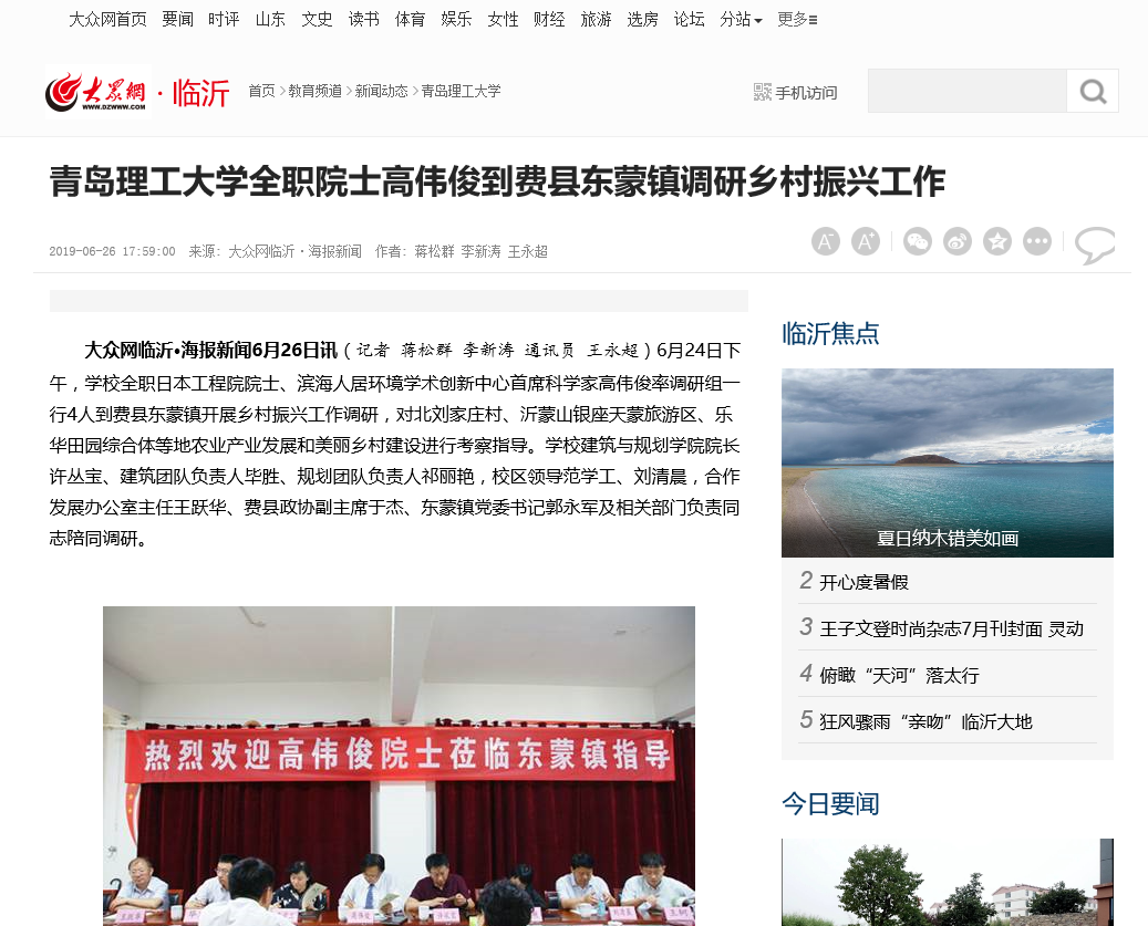 大众网临沂·海报新闻6月26日讯(记者 蒋松群 李新涛 通讯员 王永超)6月24日下午,学校全职日本工程院院士、滨海人居环境学术创新中心首席科学家高伟俊率调研组一行4人到费县东蒙镇开展乡村振兴工作调研,对北刘家庄村、沂蒙山银座天蒙旅游区、乐华田园综合体等地农业产业发展和美丽乡村建设进行考察指导。学校建筑与规划学院院长许丛宝、建筑团队负责人毕胜、规划团队负责人祁丽艳,校区领导范学工、刘清晨,合作发展办公室主任王跃华、费县政协副主席于杰、东蒙镇党委书记郭永军及相关部门负责同志陪同调研。