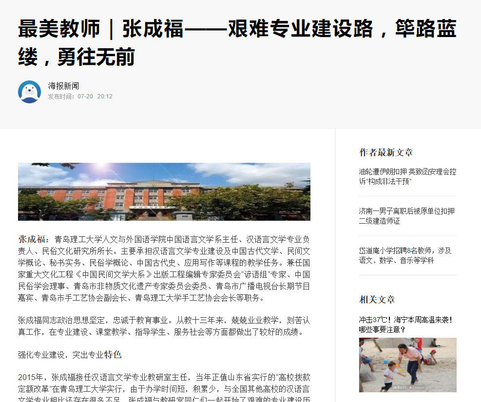 鼓励学生研究日常生活中的实际问题作为开展学术研究的第一步。从第一届毕业生开始,张成福就鼓励学生将眼光放到社会上的实际问题上进行研究,开展社会调查,撰写毕业论文。几年来,他指导的汉语言文学专业毕业生先后对潍坊状元胡同的产业化、薛禄传说的当代表现、皮影在青岛地区的传承与传播、青岛移民与高家糖球、莱州月季花节的历史及其发展、农业学大寨运动、胶南年画、西海岸新区陈姑传说、珠海街道梁祝传说等进行了较为系统的研究。其中,蒋慧敏同学撰写的毕业论文《青岛西海岸新区珠海街道梁祝传说研究》获伟德国际1946bv官网优秀毕业论文二等奖。