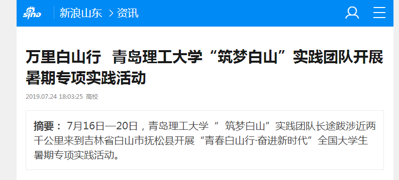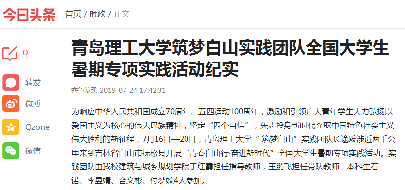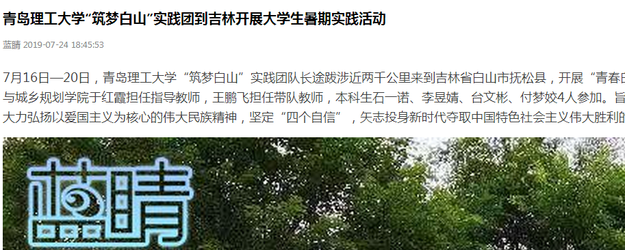 为响应中华人民共和国成立70周年、五四运动100周年,激励和引领广大青年学生大力弘扬以爱国主义为核心的伟大民族精神,坚定“四个自信”,矢志投身新时代夺取中国特色社会主义伟大胜利的新征程。7月16日—20日,伟德国际1946bv官网“ 筑梦白山”实践团队长途跋涉近两千公里来到吉林省白山市抚松县开展“青春白山行·奋进新时代”全国大学生暑期专项实践活动。实践团队由伟德官网建筑与城乡规划学院于红霞担任指导教师,王鹏飞担任带队教师,本科生石一诺、李昱婧、台文彬、付梦姣4人参加。