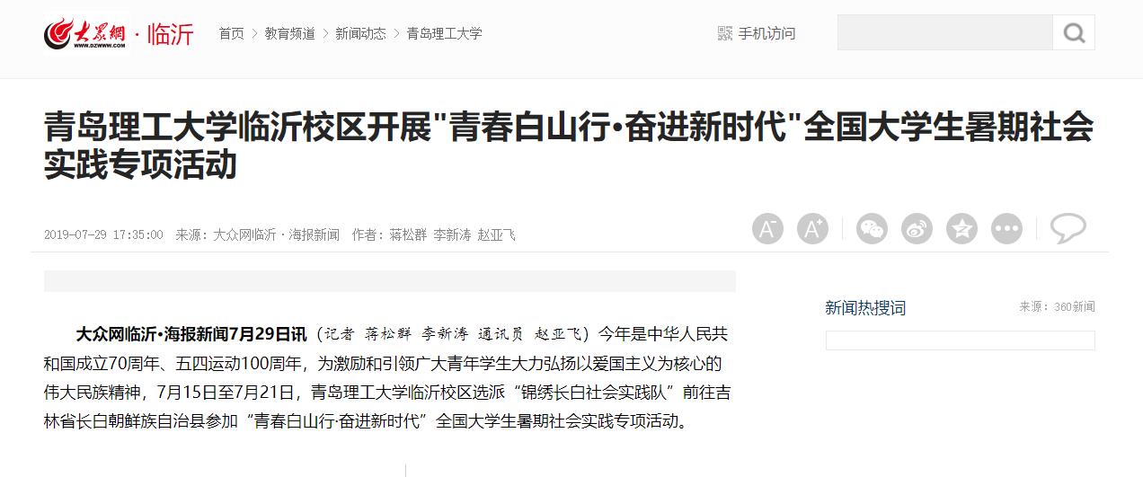 大众网临沂·海报新闻7月29日讯(记者 蒋松群 李新涛 通讯员 赵亚飞)今年是中华人民共和国成立70周年、五四运动100周年,为激励和引领广大青年学生大力弘扬以爱国主义为核心的伟大民族精神,7月15日至7月21日,伟德国际1946bv官网临沂校区选派“锦绣长白社会实践队”前往吉林省长白朝鲜族自治县参加“青春白山行·奋进新时代”全国大学生暑期社会实践专项活动。