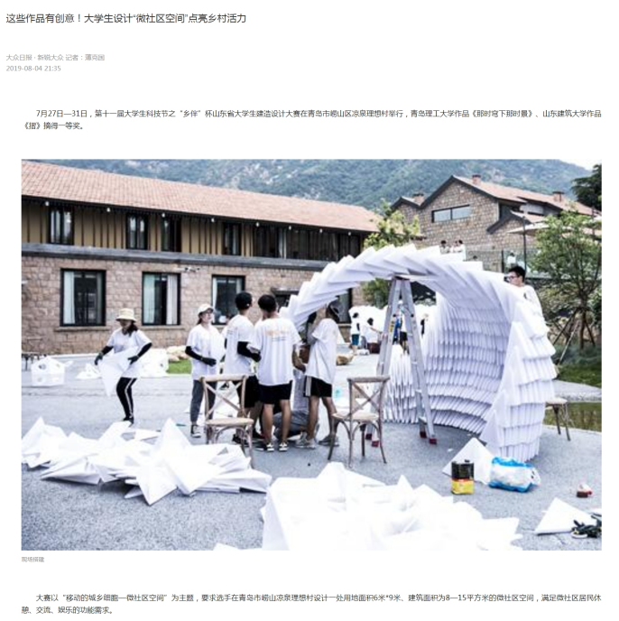 7月27日—31日,第十一届大学生科技节之“乡伴”杯山东省大学生建造设计大赛在青岛市崂山区凉泉理想村举行,伟德国际1946bv官网作品《那时穹下那时景》、山东建筑大学作品《摺》摘得一等奖。