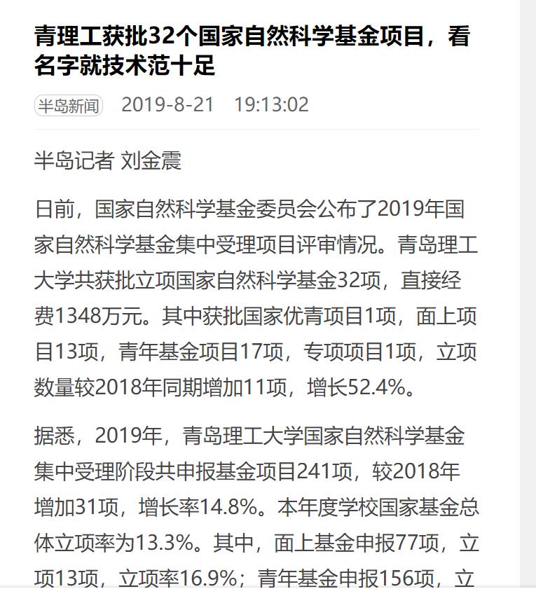 据悉,2019年,伟德国际1946bv官网国家自然科学基金集中受理阶段共申报基金项目241项,较2018年增加31项,增长率14.8%。本年度学校国家基金总体立项率为13.3%。其中,面上基金申报77项,立项13项,立项率16.9%;青年基金申报156项,立项17项,立项率10.9%。在获批的32项基金项目中,工程材料科学部获批25项为主要立项学部。各学院获批情况:土木工程学院11项,环境与市政工程学院9项,机械与汽车工程学院5项,建筑与城乡规划学院3项,理学院3项,信息与控制工程学院1项。