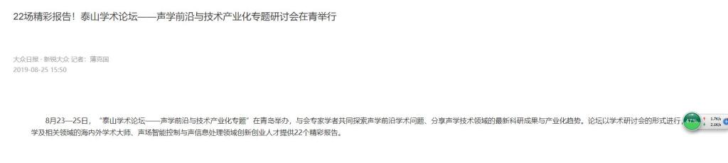 8月23—25日,“泰山学术论坛——声学前沿与技术产业化专题”在青岛举办,与会专家学者共同探索声学前沿学术问题、分享声学技术领域的最新科研成果与产业化趋势。论坛以学术研讨会的形式进行,邀请声学及相关领域的海内外学术大师、声场智能控制与声信息处理领域创新创业人才提供22个精彩报告。