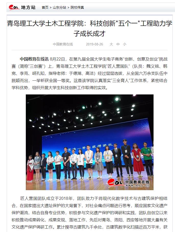 中国教育在线讯8月22日,在第九届全国大学生电子商务“创新、创意及创业”挑战赛(简称“三创赛”)上,伟德国际1946bv官网土木工程学院“匠人营国队”(队员:魏义铭、韩宽、李克、胡孔知,指导老师:于德湖、高洁)经过层层选拔,从全国六万余支队伍中脱颖而出,一举斩获全国一等奖。这是该学院认真落实“三全育人”工作体系,紧密结合学科优势,组织开展大学生科技创新工作取得的实效。