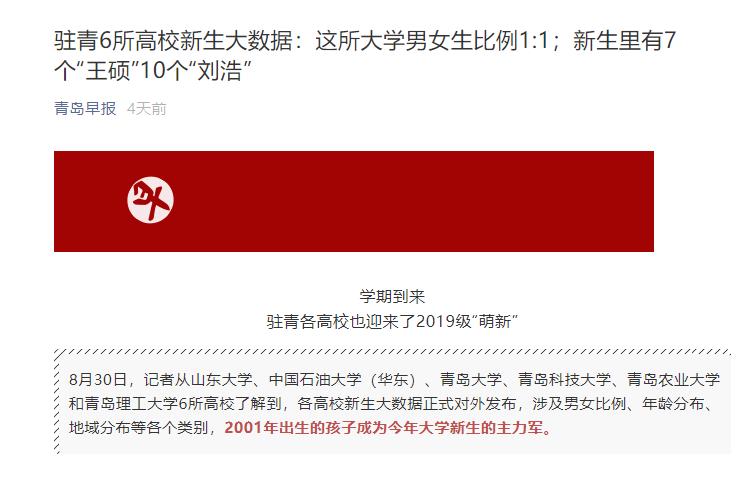 8月30日,记者从山东大学、中国石油大学(华东)、青岛大学、青岛科技大学、青岛农业大学和伟德国际1946bv官网6所高校了解到,各高校新生大数据正式对外发布,涉及男女比例、年龄分布、地域分布等各个类别,2001年出生的孩子成为今年大学新生的主力军。