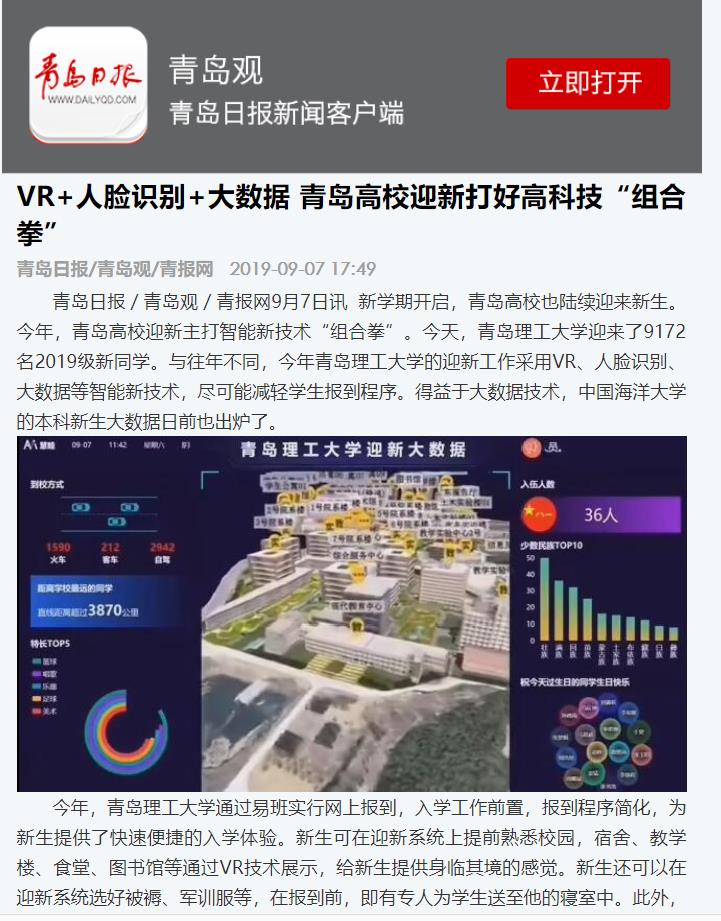 青岛日报/青岛观/青报网9月7日讯 新学期开启,青岛高校也陆续迎来新生。今年,青岛高校迎新主打智能新技术“组合拳”。今天,伟德国际1946bv官网迎来了9172名2019级新同学。与往年不同,今年伟德国际1946bv官网的迎新工作采用VR、人脸识别、大数据等智能新技术,尽可能减轻学生报到程序。得益于大数据技术,中国海洋大学的本科新生大数据日前也出炉了。