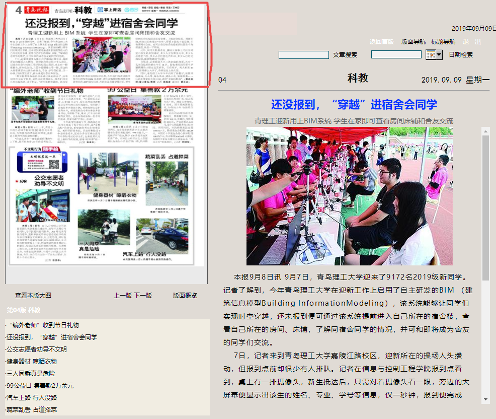 本报9月8日讯 9月7日,伟德国际1946bv官网迎来了9172名2019级新同学。记者了解到,今年伟德国际1946bv官网在迎新工作上启用了自主研发的BIM (建筑信息模型Building InformationModeling),该系统能够让同学们实现时空穿越,还未报到便可通过该系统提前进入自己所在的宿舍楼,查看自己所在的房间、床铺,了解同宿舍同学的情况,并可和即将成为舍友的同学们交流。
