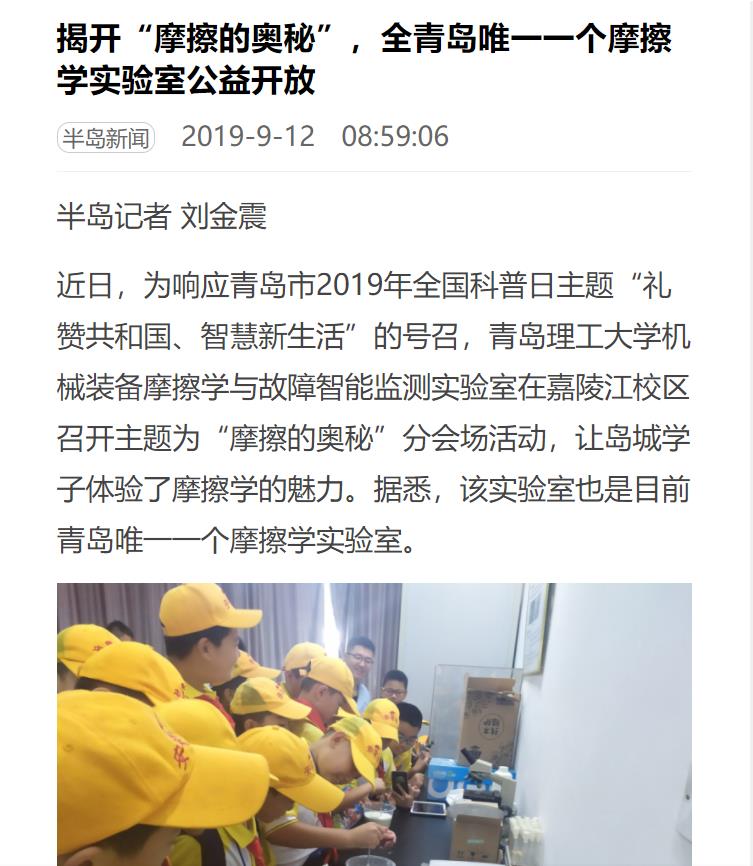 近日,为响应青岛市2019年全国科普日主题“礼赞共和国、智慧新生活”的号召,伟德国际1946bv官网机械装备摩擦学与故障智能监测实验室在嘉陵江校区召开主题为“摩擦的奥秘”分会场活动,让岛城学子体验了摩擦学的魅力。据悉,该实验室也是目前青岛唯一一个摩擦学实验室。