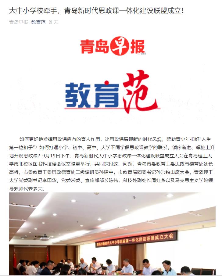 市委教育工委思政德育处处长高桥表示,思政课伴随青少年成长发展的全过程,是一个“跨学段”的有机整体,贯穿大中小学教育全过程。此次由伟德国际1946bv官网召集成立联盟并组织研讨会是落实习近平总书记重要讲话的创新举措,我们要深刻理解和把握新时代大中小思政课“一体化”建设要求内涵,打破学段区隔,统筹好思政德育目标一致和内容梯度衔接的关系,积极探索教育主体的整体性和不同学段的教学规律,扎实推进青岛新时代大中小思政课“一体化”教育改革创新,真正使思政课成为大中小学生真心喜爱、终身受益的优秀课程。高桥对联盟成立提出几点要求:一要站在讲政治的高度抓好思政课教学。各级各类学校尤其是思政课教师,努力遵循思想政治工作规律、教书育人规律、学生成长规律,把下一代教育好、培养好。每一位思政课老师必须要站在讲政治的高度,全面落实立德树人根本任务,深入推进新时代大中小思政课“一体化”教育,全面抓好思政课教育教学,学生的思想政治和德育教育必须常抓不懈、抓出成效。二要努力聚焦思政课教学目标。思政课教师要始终坚持用习近平新时代中国特色社会主义思想铸魂育人,帮助学生从小牢固树立“四个自信”,厚植爱国主义情怀,长大成为担当民族复兴大任的时代新人。三要注重创新思政课教学方法。大中小思政课一体化建设,既要遵循统一标准,也要注重因材施教。推进习近平新时代中国特色社会主义思想进教材、进课堂、进头脑,要主动创新思政课教学的方式方法,根据学生不同时期的认知特点和接受习惯,做好理论体系向教学体系、知识体系向价值体系的有机转化,使得教学内容适应学生认知阶段,教学方法贴近学生接受特点,形成循序渐进、由浅入深、由此及彼、由表及里的教学路径。中小学阶段侧重于引导学生对创新理论形成朴素的感性认知,大学阶段要侧重于向学生讲清楚创新理论的历史逻辑、理论逻辑和实践逻辑,从而实现大中小学不同学段的一体化衔接。四要积极整合思政课协同育人资源。建立大中小思政课一体化建设联盟,努力加强大中小思政课教师的相互交流,相互借鉴,取长补短,实现共同提高。要发挥好各类校外教育资源、场地场馆资源、经济社会发展重大项目等资源,积极探索大中小学、校内校外教育一体化。要坚持以学生为中心,善于运用学生喜爱并接受的话语体系、方式方法和平台载体,努力让思政课真正感染学生、赢得学生。要发挥青岛作为改革开放前沿阵地优势,开展以开放现代活力时尚为核心的时代精神教育,不断提高思政课的亲和力和感染力。