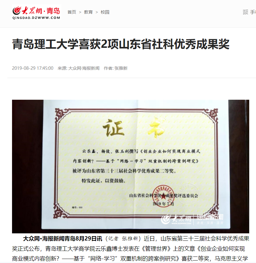 大众网·海报新闻青岛8月29日讯(记者 张雅新)近日,山东省第三十三届社会科学优秀成果奖正式公布,伟德国际1946bv官网商学院云乐鑫博士发表在《管理世界》上的文章《创业企业如何实现商业模式内容创新?——基于“网络-学习”双重机制的跨案例研究》喜获二等奖,马克思主义学院王玉喜博士参编的丛书《中国文化四季》喜获一等奖。