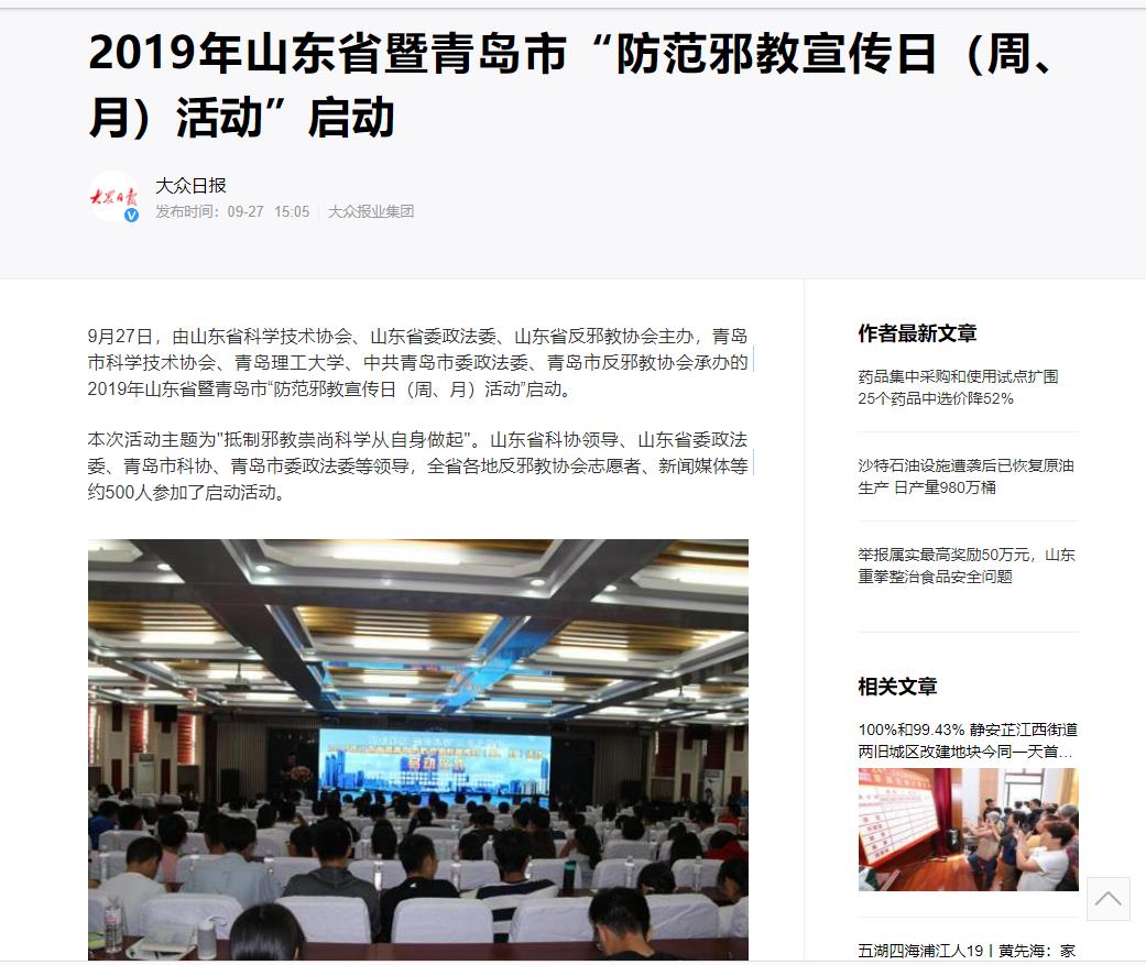 9月27日,由山东省科学技术协会、山东省委政法委、山东省反邪教协会主办,青岛市科学技术协会、伟德国际1946bv官网、中共青岛市委政法委、青岛市反邪教协会承办的2019年山东省暨青岛市“防范邪教宣传日(周、月)活动”启动。