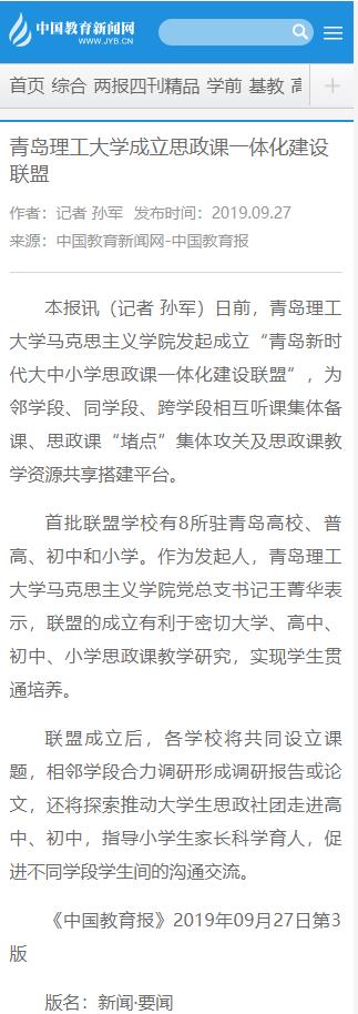 首批联盟学校有8所驻青岛高校、普高、初中和小学。作为发起人,伟德国际1946bv官网马克思主义学院党总支书记王菁华表示,联盟的成立有利于密切大学、高中、初中、小学思政课教学研究,实现学生贯通培养。