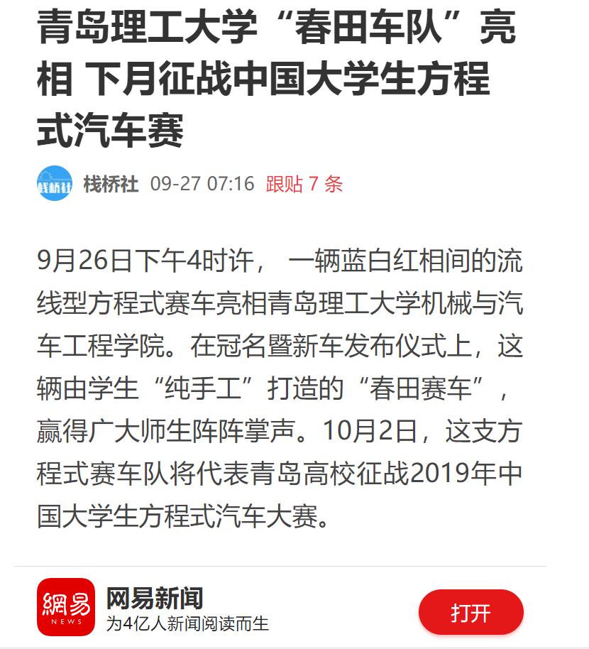 9月26日下午4时许, 一辆蓝白红相间的流线型方程式赛车亮相伟德国际1946bv官网机械与汽车工程学院。在冠名暨新车发布仪式上,这辆由学生“纯手工”打造的“春田赛车”,赢得广大师生阵阵掌声。10月2日,这支方程式赛车队将代表青岛高校征战2019年中国大学生方程式汽车大赛。