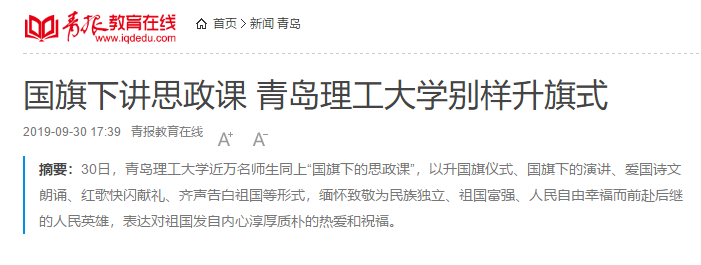 青报教育在线讯www.iqdedu.com为缅怀革命先烈,庆祝新中国成立70周年,深入开展“不忘初心、牢记使命”主题教育,激发广大师生爱国情怀,9月30日清晨,伟德国际1946bv官网近万名师生同上“国旗下的思政课”,以升国旗仪式、国旗下的演讲、爱国诗文朗诵、红歌快闪献礼、齐声告白祖国等形式,缅怀致敬为民族独立、祖国富强、人民自由幸福而前赴后继的人民英雄,表达对祖国发自内心淳厚质朴的热爱和祝福。