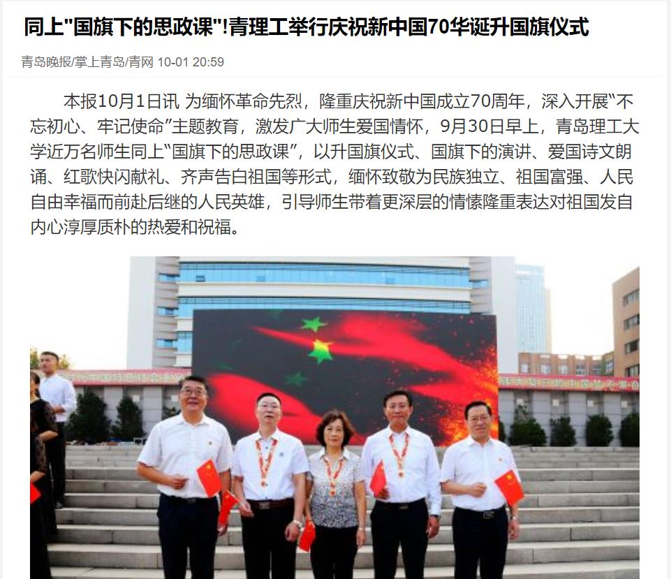 使命呼唤担当,奋斗铸就辉煌。由团委联合艺术与设计学院等单位共同举办的这堂“国旗下的思政课”,激发点燃了师生干事创业的热情,浸润擦亮了师生爱国奋斗的精神底色。在场师生表示,今后在学习和工作中,一定要将爱国信仰落实为行动自觉,在向着特色鲜明的高水平应用研究型大学建设目标奋勇前行的征程上,立起不忘初心的标尺,扛紧牢记使命的责任,唱响爱国主义主旋律,大力弘扬百折不挠、刚毅厚重、勇承重载的理工精神传统,以时不我待、只争朝夕的精神,以实际行动和优异成绩,庆祝中华人民共和国成立70周年。(青岛晚报/掌上青岛/青网 记者 杨海涛 通讯员 曹玉洁)
