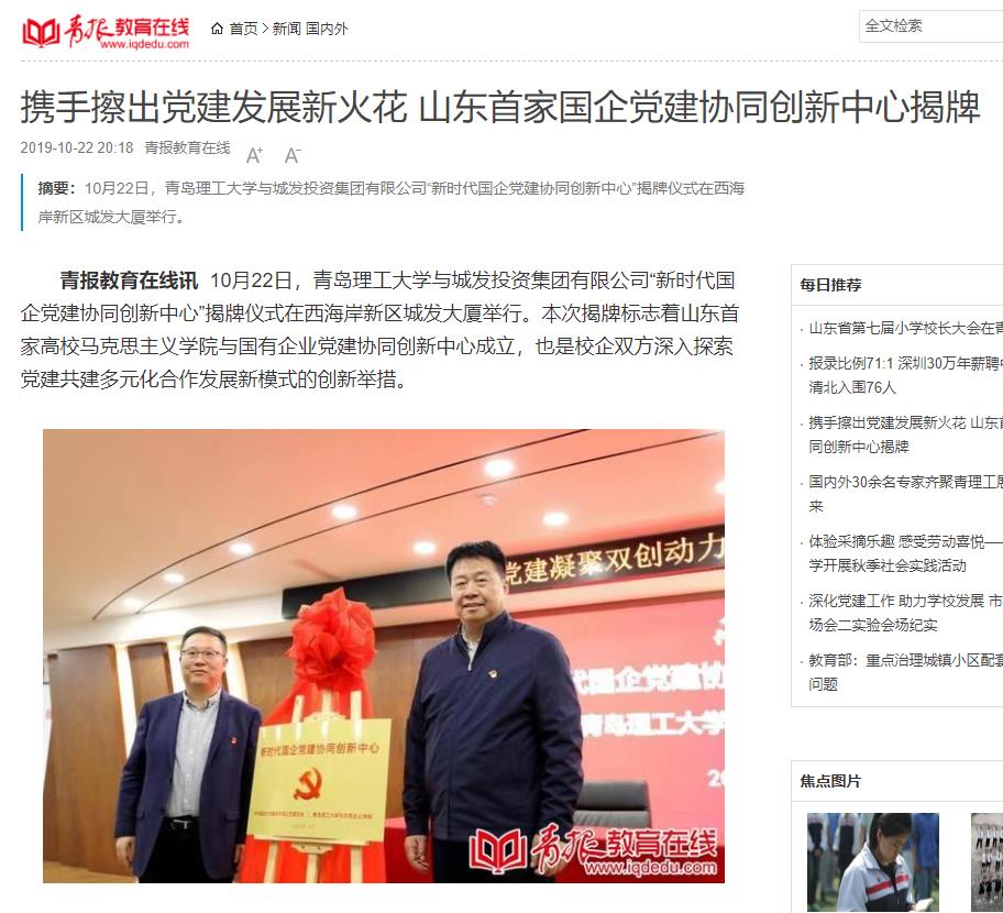 青报教育在线讯 10月22日,伟德国际1946bv官网与城发投资集团有限公司“新时代国企党建协同创新中心”揭牌仪式在西海岸新区城发大厦举行。本次揭牌标志着山东首家高校马克思主义学院与国有企业党建协同创新中心成立,也是校企双方深入探索党建共建多元化合作发展新模式的创新举措。
