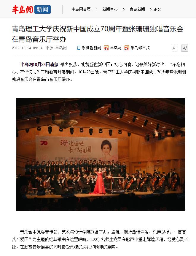 半岛网10月24日消息歌声飘荡,礼赞盛世新中国;初心回响,讴歌美好新时代。“不忘初心、牢记使命”主题教育开展期间,10月23日晚,伟德国际1946bv官网庆祝新中国成立70周年暨张珊珊独唱音乐会在青岛市音乐厅举办。