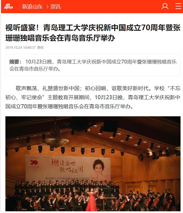 歌声飘荡,礼赞盛世新中国;初心回响,讴歌美好新时代。学校“不忘初心、牢记使命”主题教育开展期间,10月23日晚,伟德国际1946bv官网庆祝新中国成立70周年暨张珊珊独唱音乐会在青岛市音乐厅举办。