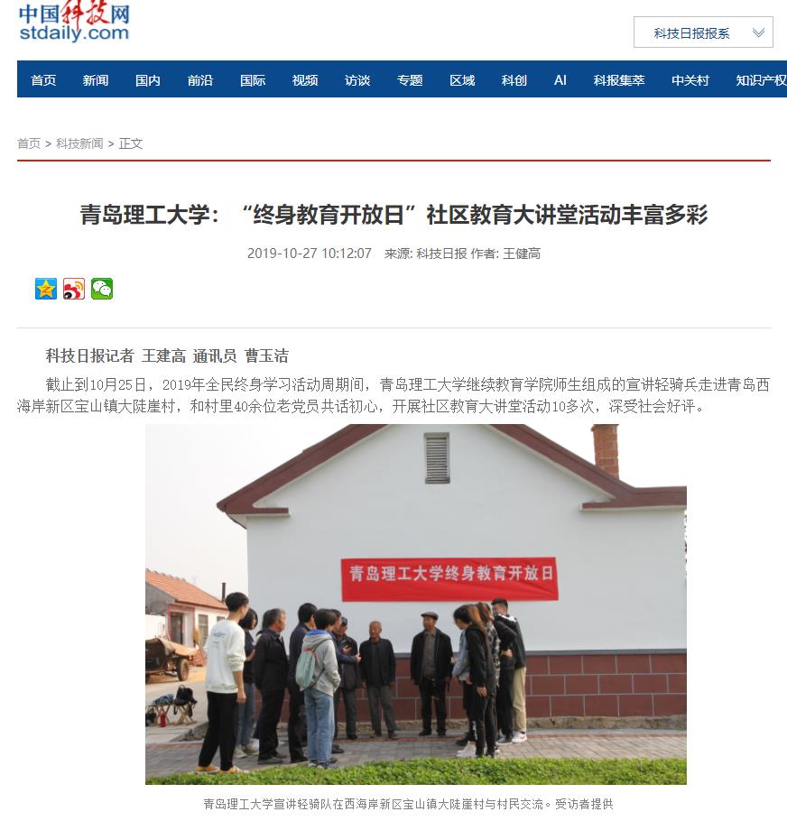 截止到10月25日,2019年全民终身学习活动周期间,伟德国际1946bv官网继续教育学院师生组成的宣讲轻骑兵走进青岛西海岸新区宝山镇大陡崖村,和村里40余位老党员共话初心,开展社区教育大讲堂活动10多次,深受社会好评。