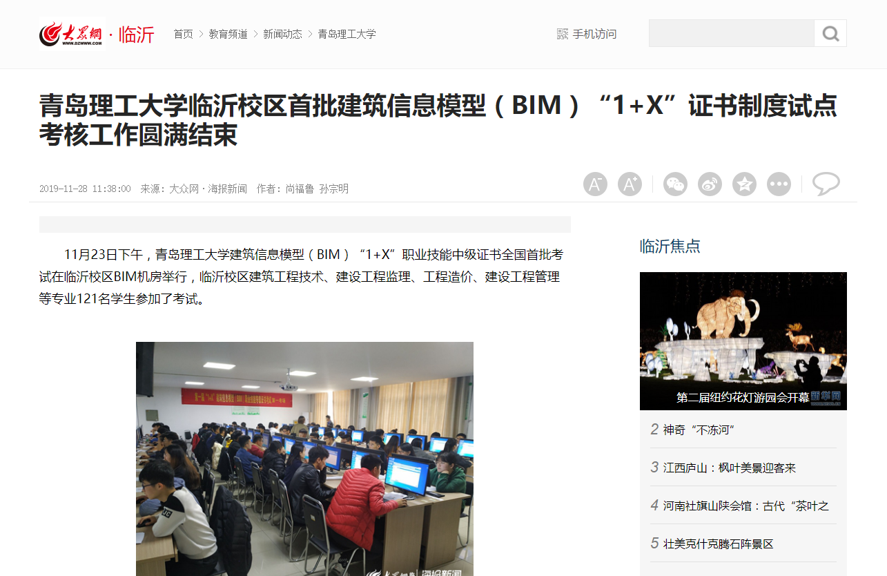 教育部2019年在职业院校和应用型本科高校启动的“1+X”证书制度,是国家推进职业教育和产教融合、提高人才培养质量的新举措,是技术技能人才培养的新模式。今年6月以来,学校相继获批建筑信息模型、智能财税“1+X”首批试点院校。为确保职业技能等级证书培训和考核工作顺利开展,临沂校区高度重视,成立了专门工作小组,小组围绕职业技能入课的理念修订了培养方案,精心组织学生集中培训,按照《关于开展2019年建筑信息模型(BIM)职业技能等级证书考评工作的通知》要求完成了场地布置、学生动员、监考人员培训等工作,为此次考试做了充分准备。考试过程中,同学们认真审题答卷,监考教师严肃考场纪律,并按要求及时上报相关考试数据。