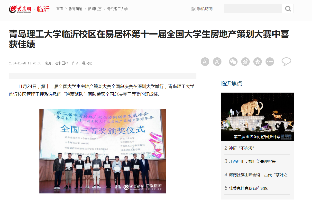 11月24日,第十一届全国大学生房地产策划大赛全国总决赛在深圳大学举行,伟德国际1946bv官网临沂校区管理工程系选派的“鸿蒙战队”团队荣获全国总决赛三等奖的好成绩。