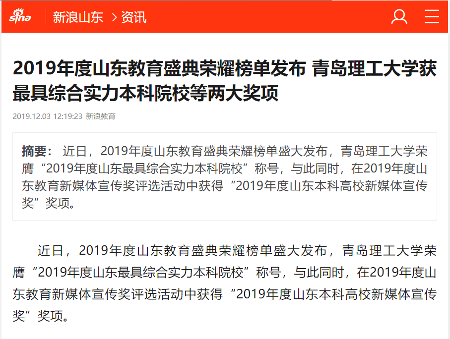 近日,2019年度山东教育盛典荣耀榜单盛大发布,伟德国际1946bv官网荣膺“2019年度山东最具综合实力本科院校”称号,与此同时,在2019年度山东教育新媒体宣传奖评选活动中获得“2019年度山东本科高校新媒体宣传奖”奖项。