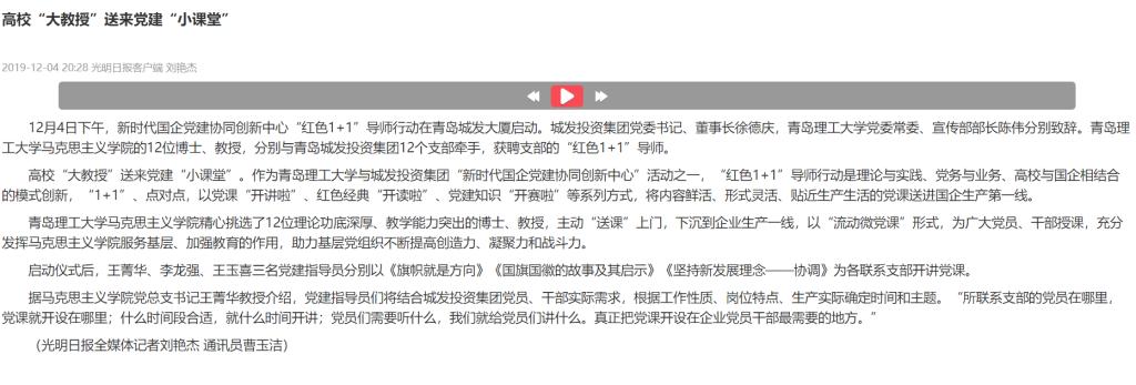 12月4日下午,新时代国企党建协同创新中心“红色1+1”导师行动在青岛城发大厦启动。城发投资集团党委书记、董事长徐德庆,伟德国际1946bv官网党委常委、宣传部部长陈伟分别致辞。伟德国际1946bv官网马克思主义学院的12位博士、教授,分别与青岛城发投资集团12个支部牵手,获聘支部的“红色1+1”导师。