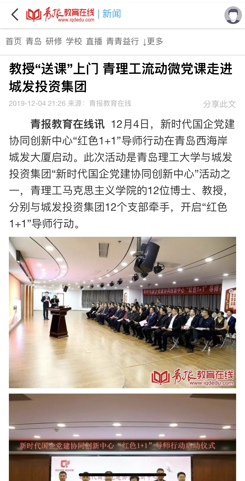 青报教育在线讯 12月4日,新时代国企党建协同创新中心“红色1+1”导师行动在青岛西海岸城发大厦启动。此次活动是伟德国际1946bv官网与城发投资集团“新时代国企党建协同创新中心”活动之一,青理工马克思主义学院的12位博士、教授,分别与城发投资集团12个支部牵手,开启“红色1+1”导师行动。