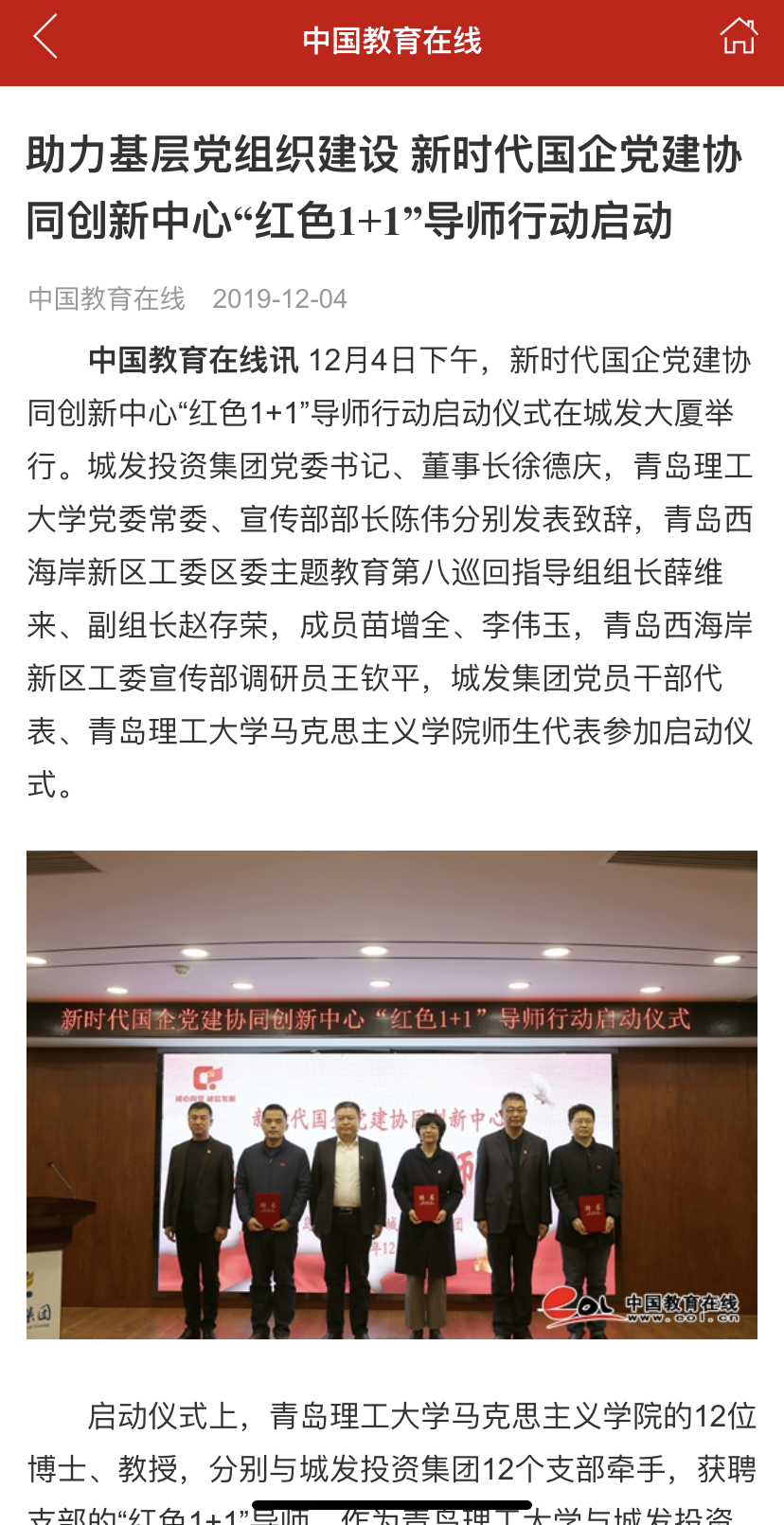 中国教育在线讯12月4日下午,新时代国企党建协同创新中心“红色1+1”导师行动启动仪式在城发大厦举行。城发投资集团党委书记、董事长徐德庆,伟德国际1946bv官网党委常委、宣传部部长陈伟分别发表致辞,青岛西海岸新区工委区委主题教育第八巡回指导组组长薛维来、副组长赵存荣,成员苗增全、李伟玉,青岛西海岸新区工委宣传部调研员王钦平,城发集团党员干部代表、伟德国际1946bv官网马克思主义学院师生代表参加启动仪式。