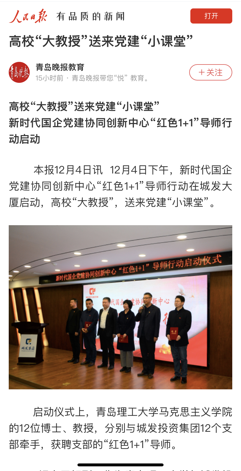 本报12月4日讯 12月4日下午,新时代国企党建协同创新中心“红色1+1”导师行动在城发大厦启动,高校“大教授”,送来党建“小课堂”。