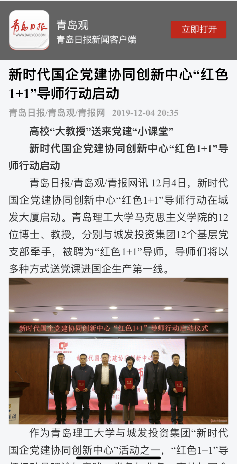 青岛日报/青岛观/青报网讯 12月4日,新时代国企党建协同创新中心“红色1+1”导师行动在城发大厦启动。伟德国际1946bv官网马克思主义学院的12位博士、教授,分别与城发投资集团12个基层党支部牵手,被聘为“红色1+1”导师,导师们将以多种方式送党课进国企生产第一线。