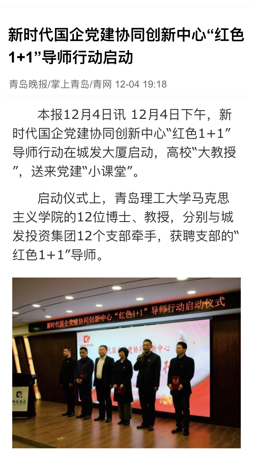 本报12月4日讯 12月4日下午,新时代国企党建协同创新中心“红色1+1”导师行动在城发大厦启动,高校“大教授”,送来党建“小课堂”。