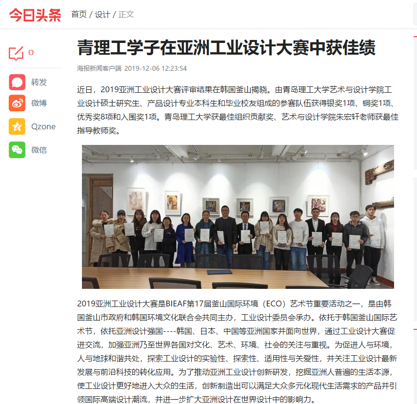 近日,2019亚洲工业设计大赛评审结果在韩国釜山揭晓。由伟德国际1946bv官网艺术与设计学院工业设计硕士研究生、产品设计专业本科生和毕业校友组成的参赛队伍获得银奖1项、铜奖1项、优秀奖8项和入围奖1项。伟德国际1946bv官网获最佳组织贡献奖、艺术与设计学院朱宏轩老师获最佳指导教师奖。