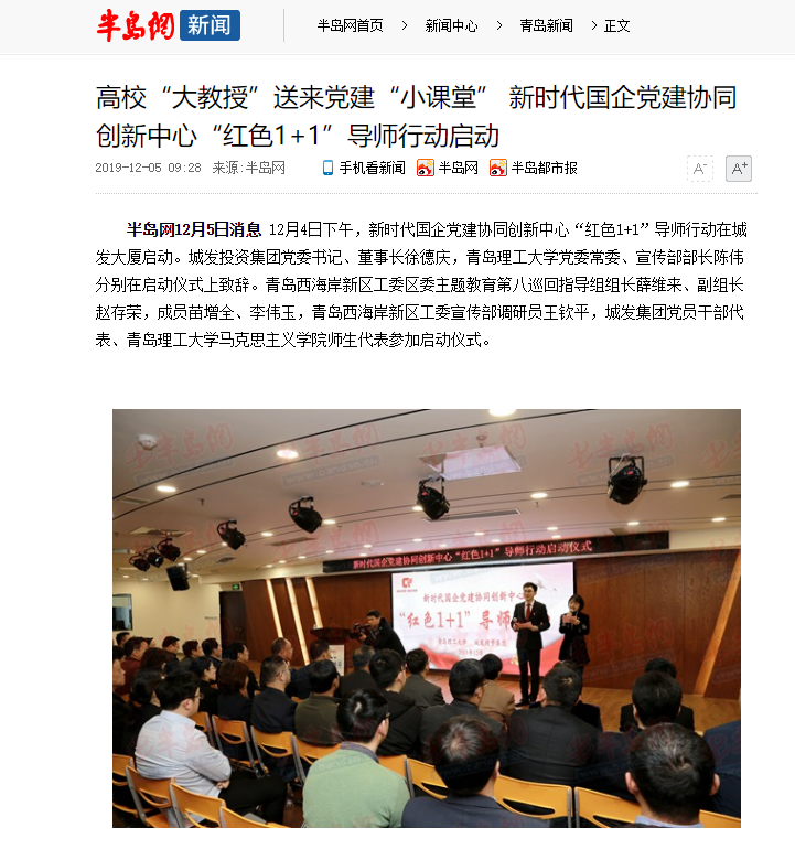 半岛网12月5日消息12月4日下午,新时代国企党建协同创新中心“红色1+1”导师行动在城发大厦启动。城发投资集团党委书记、董事长徐德庆,伟德国际1946bv官网党委常委、宣传部部长陈伟分别在启动仪式上致辞。青岛西海岸新区工委区委主题教育第八巡回指导组组长薛维来、副组长赵存荣,成员苗增全、李伟玉,青岛西海岸新区工委宣传部调研员王钦平,城发集团党员干部代表、伟德国际1946bv官网马克思主义学院师生代表参加启动仪式。