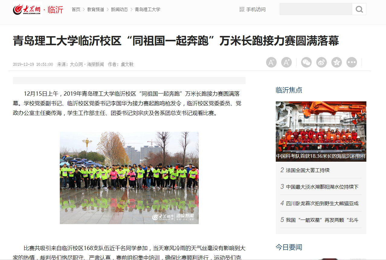 临沂校区自2016年起,每年举办一场万米长跑接力赛,2019年正值新中国成立70周年,以“同祖国一起奔跑”为主题,旨在增强青年学子爱国主义精神,丰富校园体育文化生活,让学生走下网络、走出宿舍、走向操场,进一步激发学生参与运动的热情,营造学生热爱生活、积极向上的校园文化氛围。