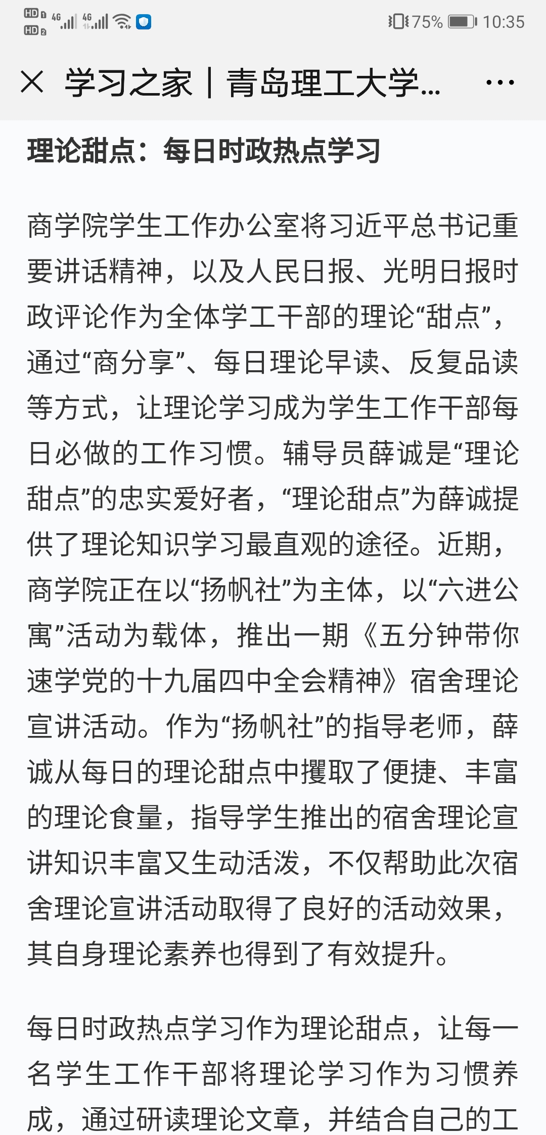 商学院学生工作办公室将习近平总书记重要讲话精神,以及人民日报、光明日报时政评论作为全体学工干部的理论“甜点”,通过“商分享”、每日理论早读、反复品读等方式,让理论学习成为学生工作干部每日必做的工作习惯。辅导员薛诚是“理论甜点”的忠实爱好者,“理论甜点”为薛诚提供了理论知识学习最直观的途径。近期,商学院正在以“扬帆社”为主体,以“六进公寓”活动为载体,推出一期《五分钟带你速学党的十九届四中全会精神》宿舍理论宣讲活动。作为“扬帆社”的指导老师,薛诚从每日的理论甜点中攫取了便捷、丰富的理论食量,指导学生推出的宿舍理论宣讲知识丰富又生动活泼,不仅帮助此次宿舍理论宣讲活动取得了良好的活动效果,其自身理论素养也得到了有效提升。