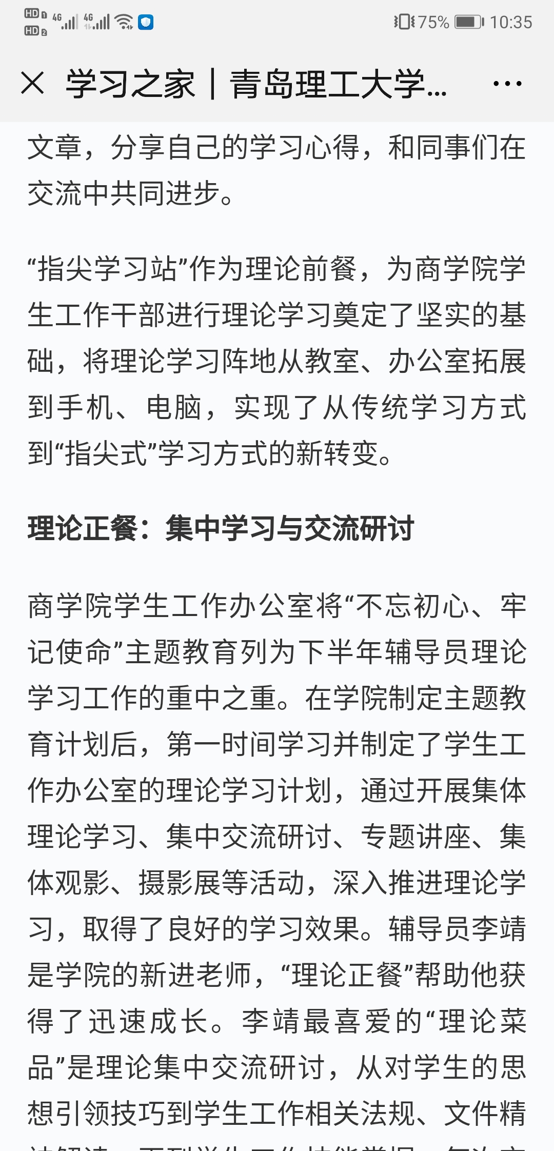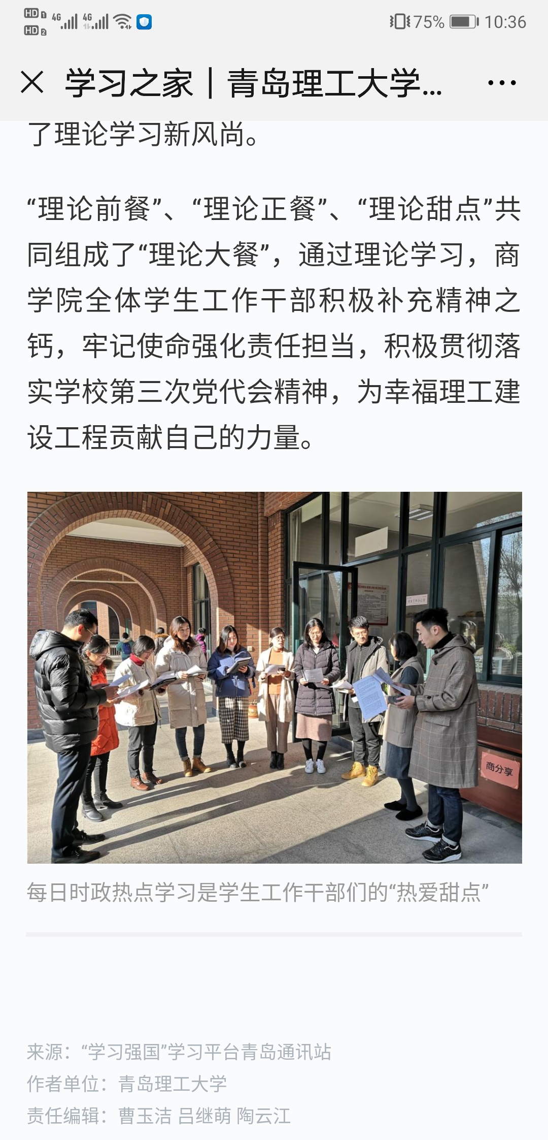 “指尖学习站”作为理论前餐,为商学院学生工作干部进行理论学习奠定了坚实的基础,将理论学习阵地从教室、办公室拓展到手机、电脑,实现了从传统学习方式到“指尖式”学习方式的新转变。