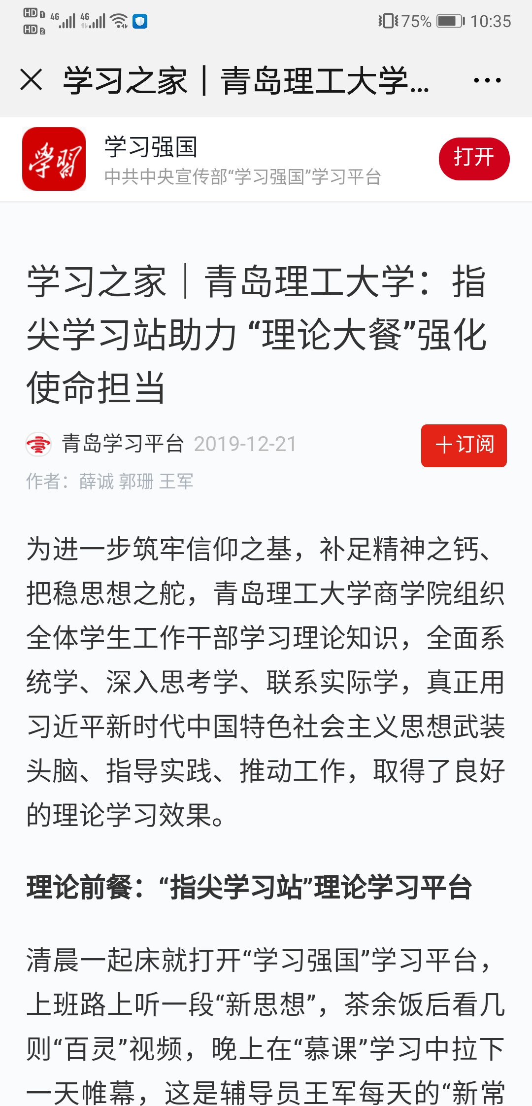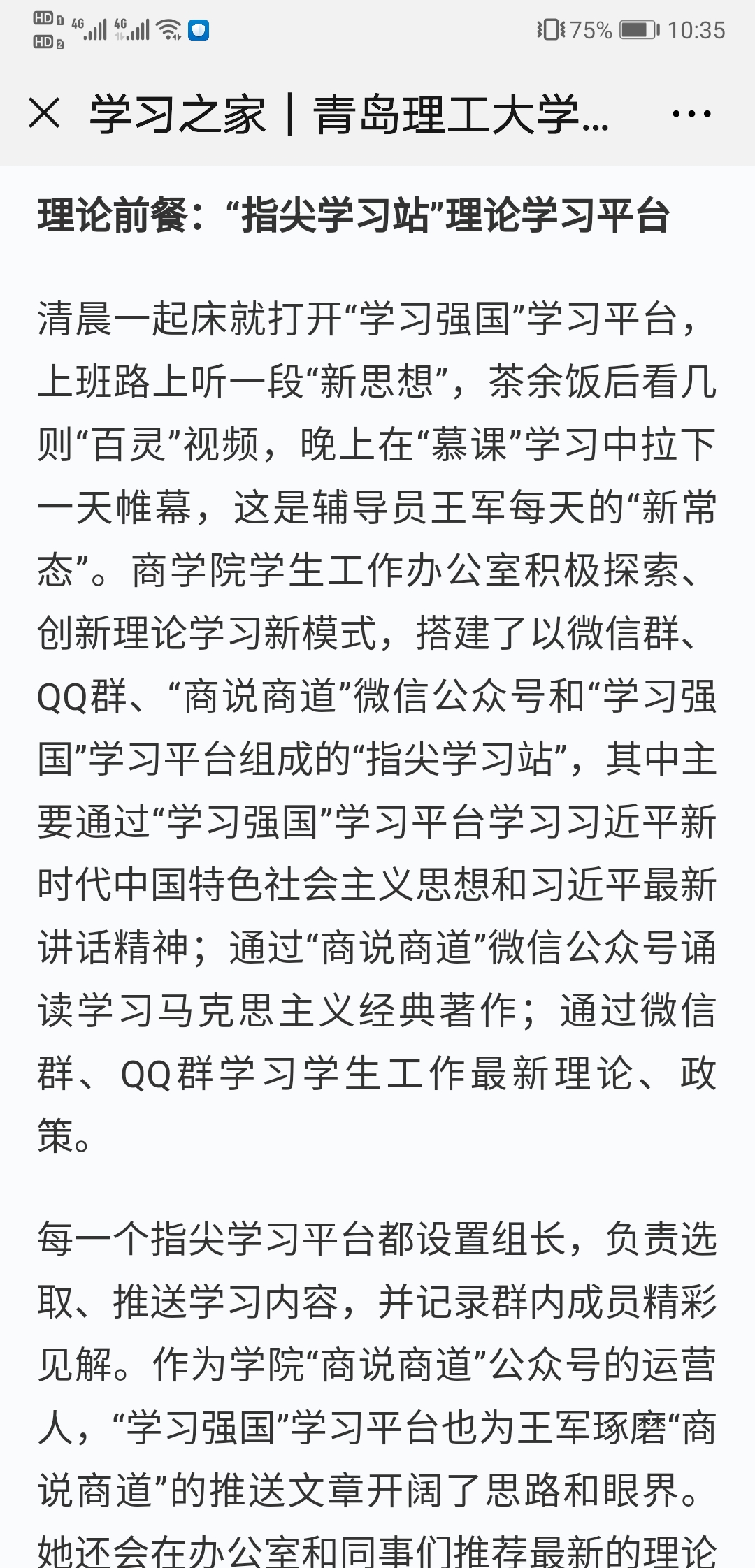 每一个指尖学习平台都设置组长,负责选取、推送学习内容,并记录群内成员精彩见解。作为学院“商说商道”公众号的运营人,“学习强国”学习平台也为王军琢磨“商说商道”的推送文章开阔了思路和眼界。她还会在办公室和同事们推荐最新的理论文章,分享自己的学习心得,和同事们在交流中共同进步。