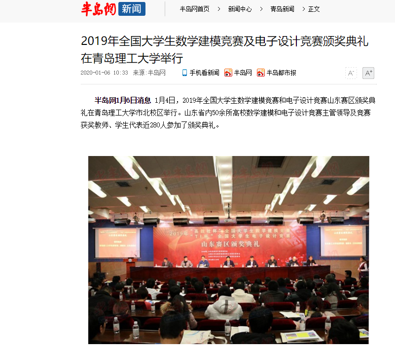 半岛网1月6日消息1月4日,2019年全国大学生数学建模竞赛和电子设计竞赛山东赛区颁奖典礼在伟德国际1946bv官网市北校区举行。山东省内50余所高校数学建模和电子设计竞赛主管领导及竞赛获奖教师、学生代表近280人参加了颁奖典礼。