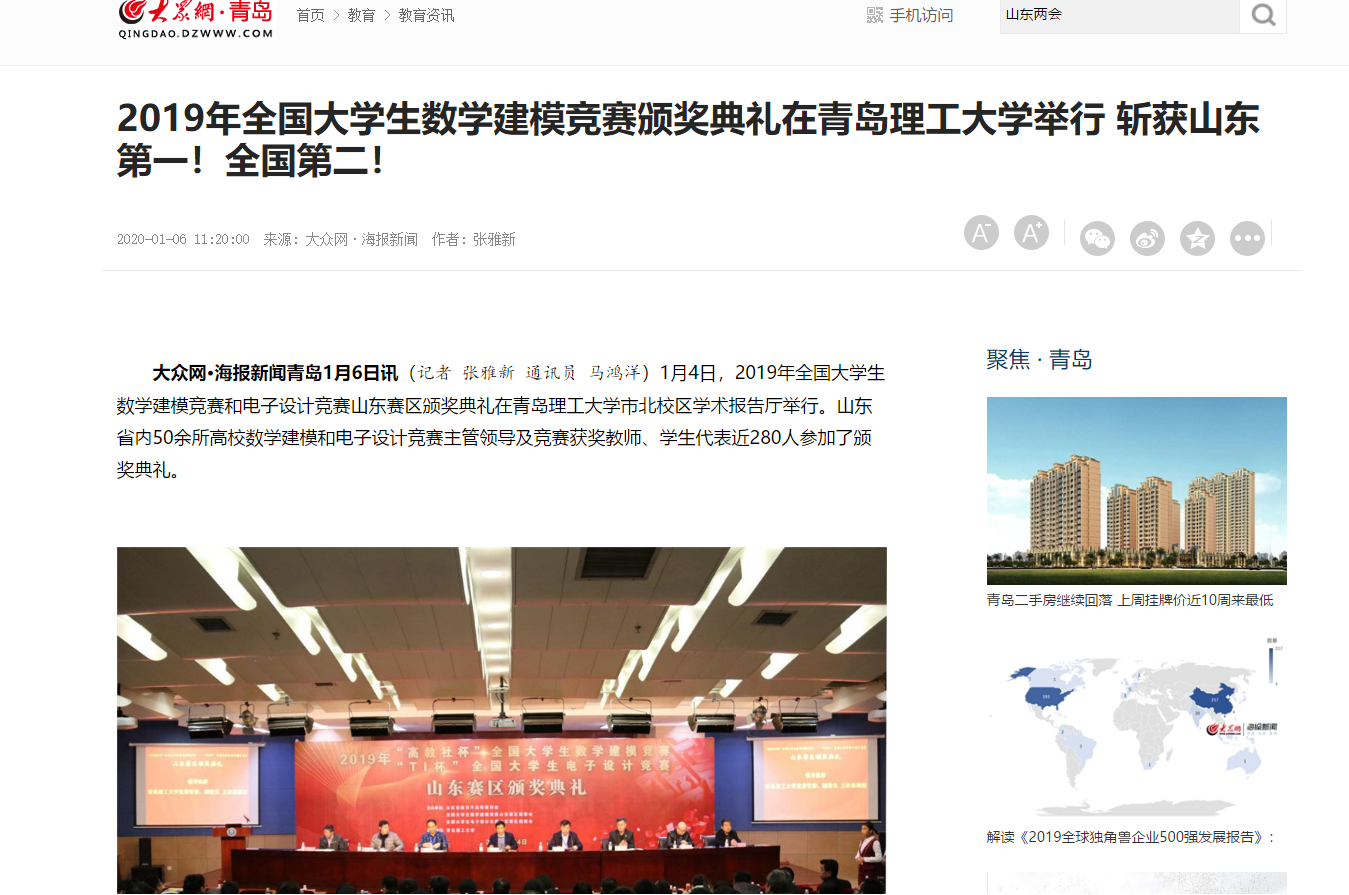 大众网·海报新闻青岛1月6日讯(记者 张雅新 通讯员 马鸿洋)1月4日,2019年全国大学生数学建模竞赛和电子设计竞赛山东赛区颁奖典礼在伟德国际1946bv官网市北校区学术报告厅举行。山东省内50余所高校数学建模和电子设计竞赛主管领导及竞赛获奖教师、学生代表近280人参加了颁奖典礼。