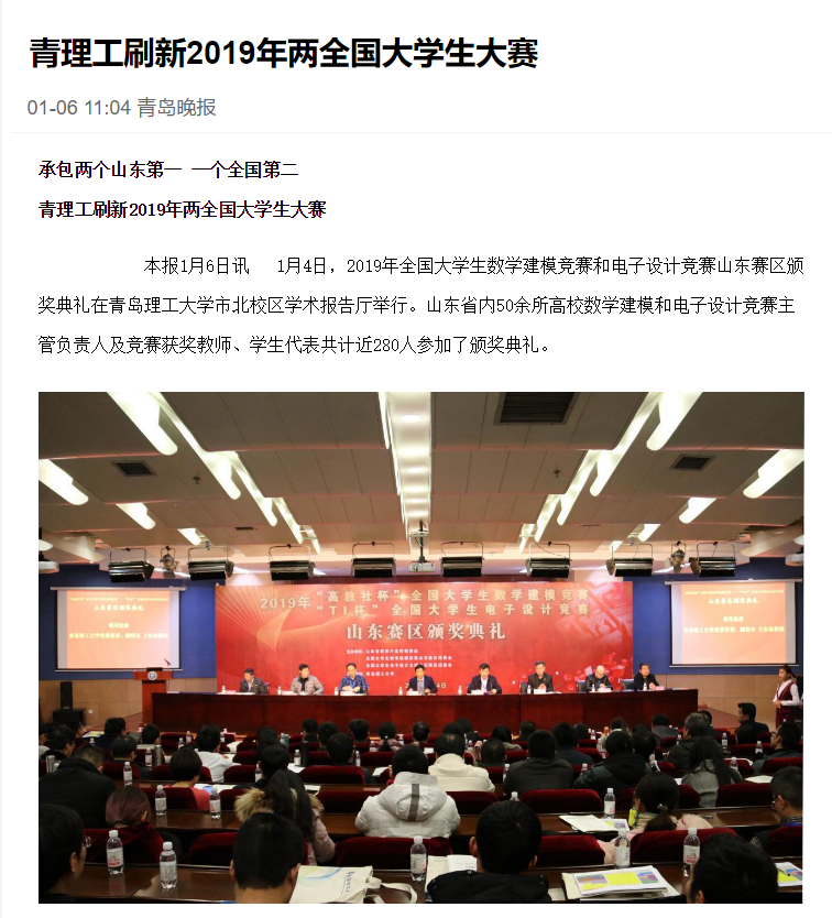 本报1月6日讯 1月4日,2019年全国大学生数学建模竞赛和电子设计竞赛山东赛区颁奖典礼在伟德国际1946bv官网市北校区学术报告厅举行。山东省内50余所高校数学建模和电子设计竞赛主管负责人及竞赛获奖教师、学生代表共计近280人参加了颁奖典礼。