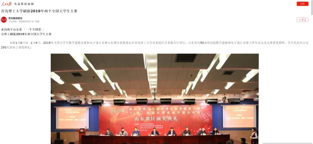 典礼表彰了2019年竞赛获奖参赛队以及获山东赛区优秀组织工作奖的20所院校。2019年全国大学生数学建模竞赛,山东省106所院校共3601队参加,其中本科组获全国一等奖32队、全国二等奖78队,分别占本科组获国一、国二奖队数的10.8%和6.5%。专科组学生获全国一等奖2队、全国二等奖9队,分别占专科组获国一、国二奖队数的4.4%和6%。20所院校获山东赛区优秀组织工作奖,20位教师获优秀指导教师奖。